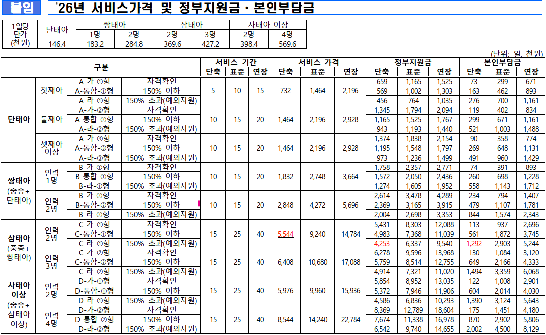 26년 산모 · 신생아 건강관리 지원사업 서비스가격 및 정부지원금